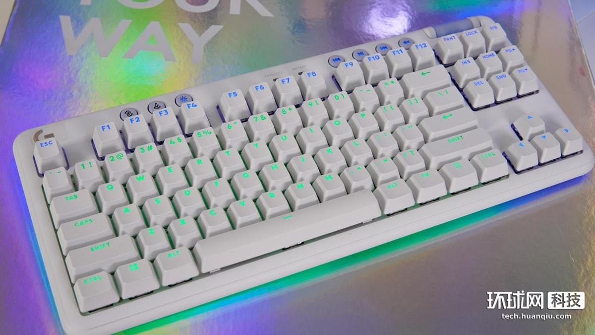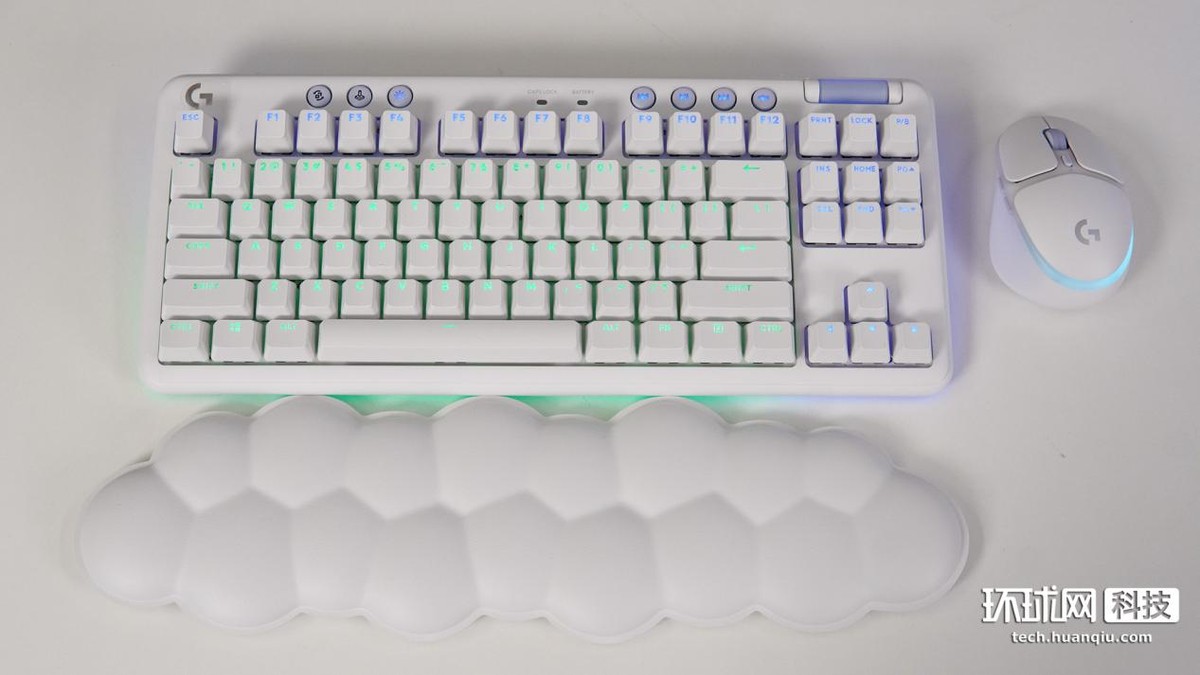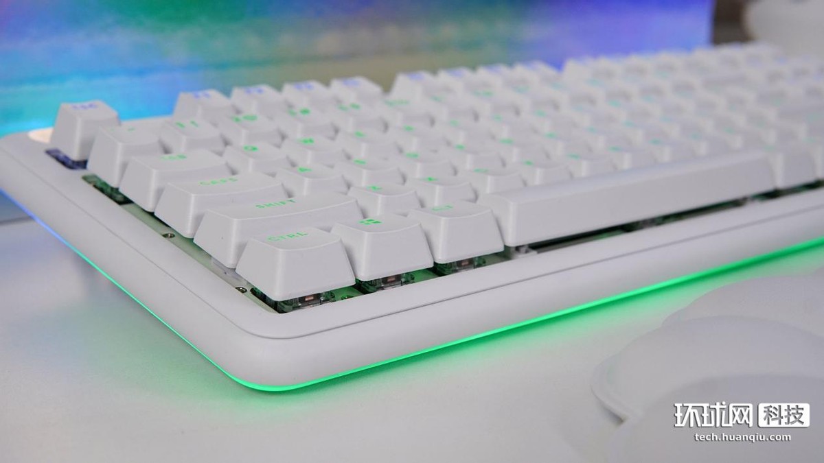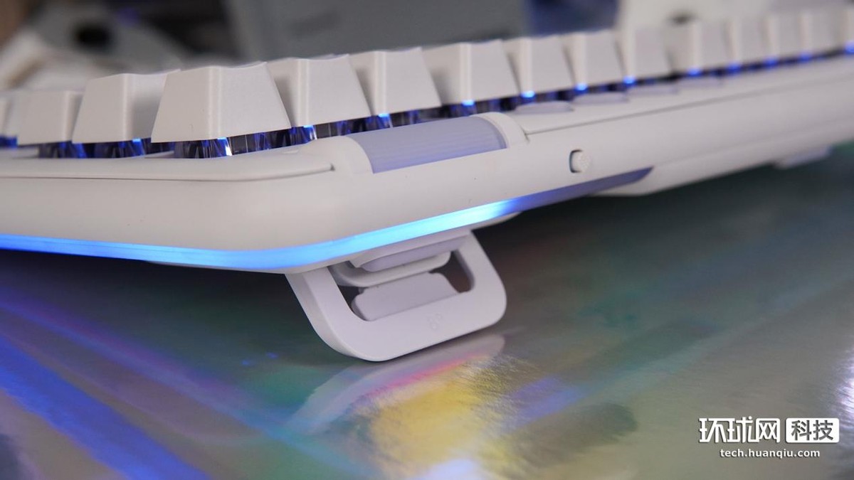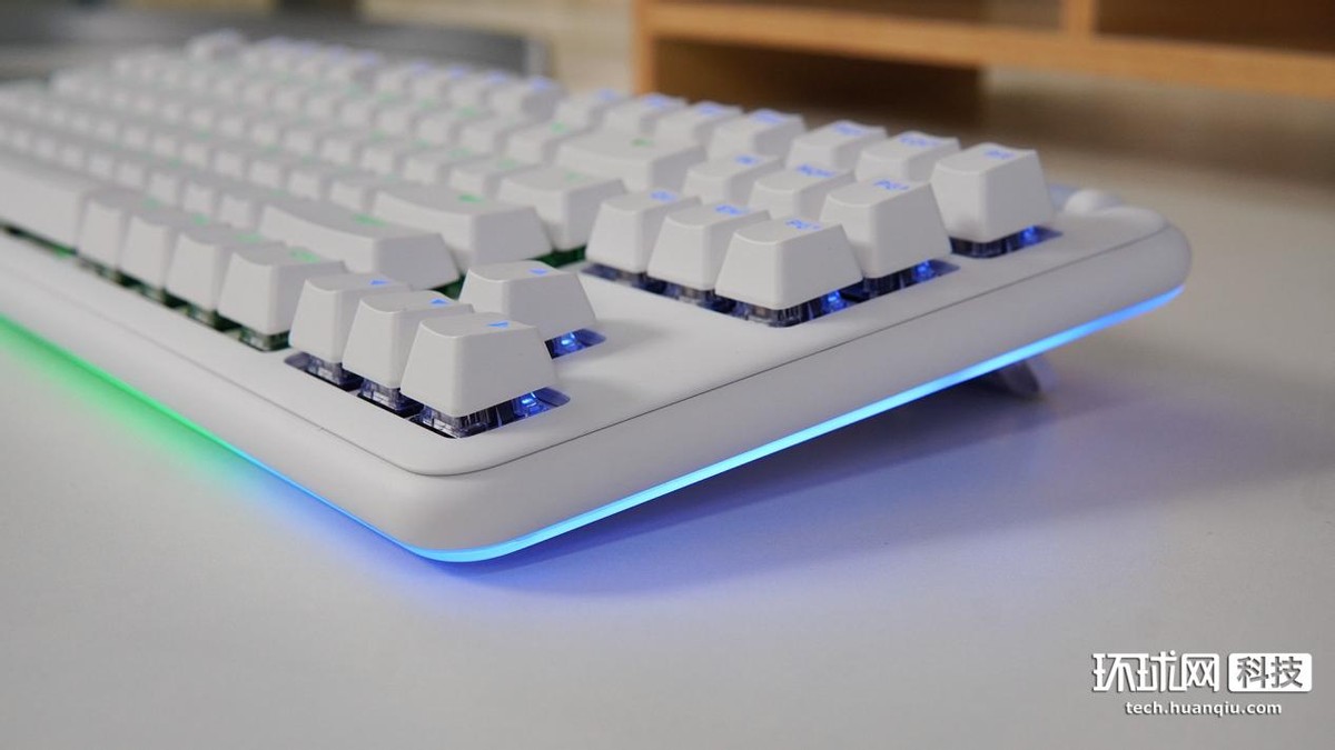 鍵盤整體呈白色,正面採用了87鍵佈局,鍵帽表面為磨砂紋理質感,有很好的段落感。鍵盤上方分佈着音量滾輪和7個額外的圓形按鈕,包括右側的4個媒體鍵及左側的“無線連接”、“遊戲模式”和“RGB燈效”三個功能鍵。