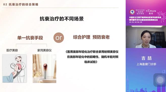 在8月24日舉行的衞星會議上,專家們對相關熱點專題進行了研討,上海盈健門診部業務院長吉喆進行了主題為《醫用面部年輕化治療聯合家用美容儀在面部年輕化的臨牀實驗研究》的演講,據吉喆介紹,該實驗通過前瞻性、隨機半臉對照研究,比較常規醫美項目聯合雅萌ACE 五代美容儀對面部年輕化的改善效果,對家用美容儀在進行醫療美容項目後的療效及安全性進行觀察,並從主觀及客觀評價上判定其與醫用面部年輕化治療的聯合效果。