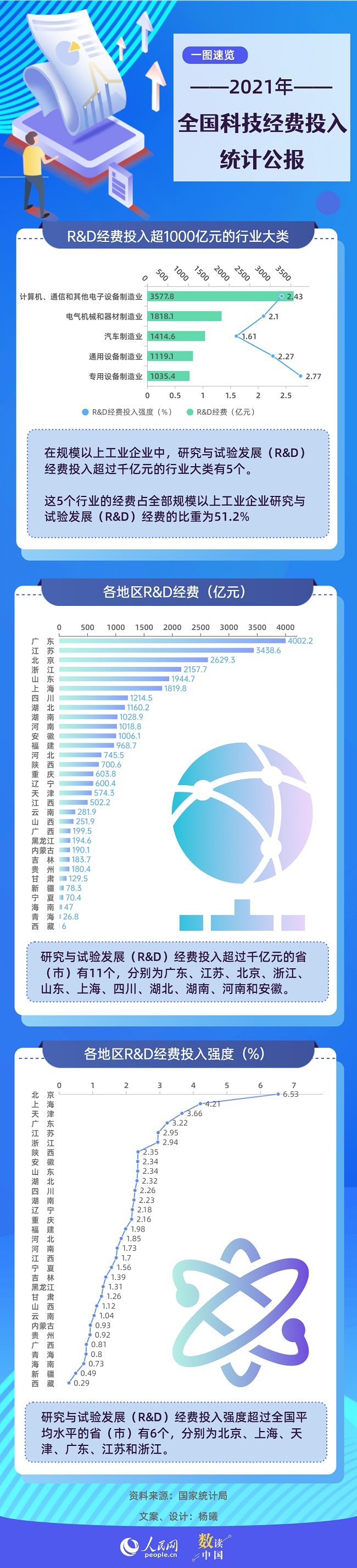 分地區看,研究與試驗發展(R&D)經費投入超過千億元的省(市)有11個,分別為廣東(4002.2億元)、江蘇(3438.6億元)、北京(2629.3億元)、浙江(2157.7億元)、山東(1944.7億元)、上海(1819.8億元)、四川(1214.5億元)、湖北(1160.2億元)、湖南(1028.9億元)、河南(1018.8億元)和安徽(1006.1億元)。研究與試驗發展(R&D)經費投入強度(與地區生產總值之比)超過全國平均水平的省(市)有6個,分別為北京、上海、天津、廣東、江蘇和浙江。