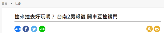 【環球網報道 實習記者 孫嘉龍】據台灣聯合新聞網等台媒報道,台南今日(9月2日)上午發生衝突事件,兩名男子在發生爭吵後,各自開車衝撞對方住宅鐵門泄憤,其中一男子更是多次衝撞對方家門,所幸無人受傷,目前警方正依照毀損、恐嚇等罪名對涉事人進行調查。對此,同樣報道此事的島內親綠媒體《自由時報》稱:“撞來撞去好玩嗎?”