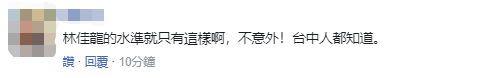 對於林佳龍的言論,有島內網友在台媒評論區留言表示,“林佳龍的水準就只有這樣啊,不意外!台中人都知道。”