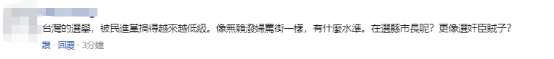 還有人稱,“台灣的選舉,被民進黨搞得越來越低級。像無賴潑婦罵街一樣,有什麼水準。在選縣市長呢?更像選奸臣賊子?”“選舉以來最好笑的新聞!”