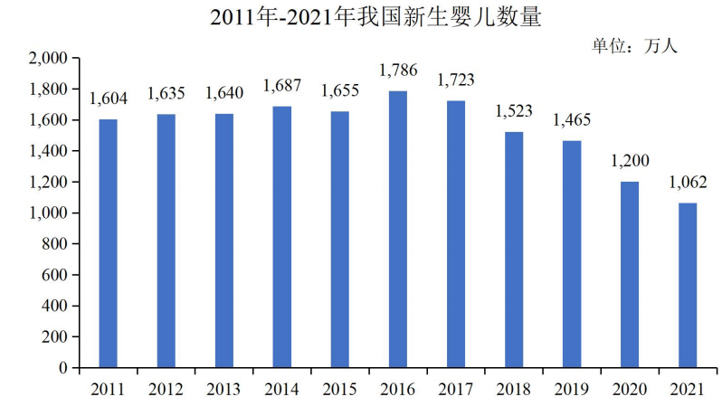 2011年至2019年,我國0-15歲兒童數量及佔比均呈增長趨勢。同時,2011年至 2021 年,我國新出生人口總計達到 1.70 億人,龐大的兒童和新生兒基數為我國童裝行業發展奠定了市場基礎。2011年-2021年,我國新生嬰兒數量情況如下: