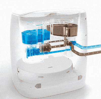 目前市面上大多數掃地機器人附帶的方形基站裏,就隱藏着品牌對這一訴求的回應。雲鯨智能首席營銷官閻樂介紹,雲鯨研發了會自動清洗拖布的掃拖一體機器人——雲鯨J1。它的基站裏有兩個水箱,分別儲存清水、收集髒水。清水通過管道噴灑到髒拖布上,拖布像被用洗衣板搓洗一樣,在基站內由條形和點狀凸起組成的“清洗肋”旋轉清洗,接着剩餘污水被回收至污水箱裏。