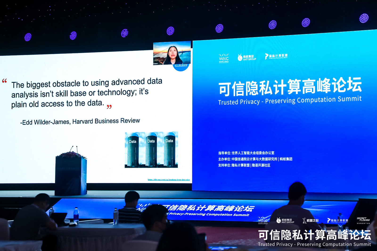 可信隱私計算高峯論壇由世界人工智能大會組委會辦公室指導,中國信通院雲計算與大數據研究所、螞蟻集團、機器之心主辦,隱私計算聯盟、隱語開源社區共同支持,上海市經濟和信息化委員會副主任張英出席並發表了致辭。