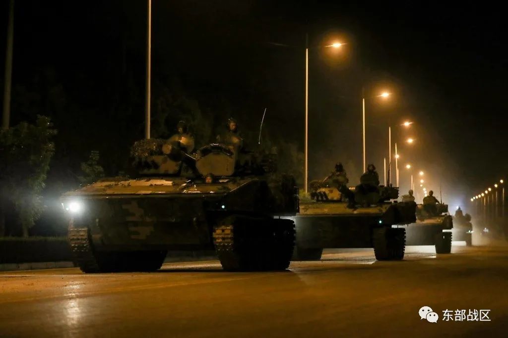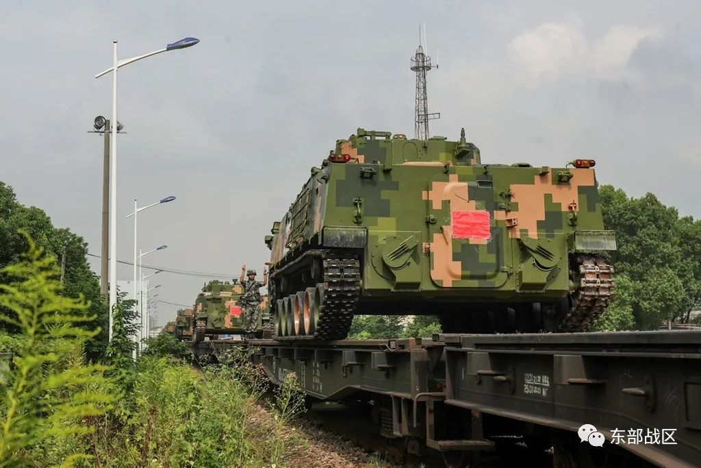 ▲裝甲裝備駛上鐵路平板專列,開赴駐訓場。