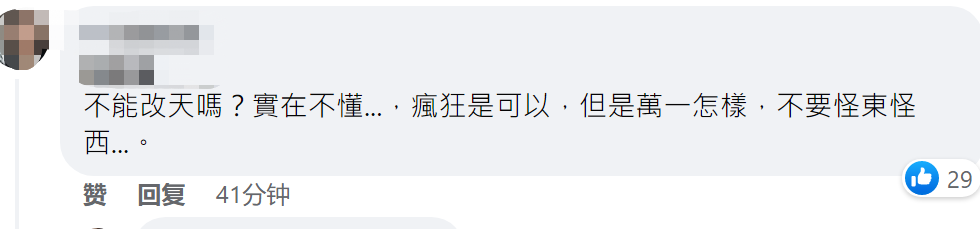 對於日月潭萬人泳渡活動今日在暴雨中登場,有島內網友表示擔心:“不能改天嗎?實在不懂,瘋狂是可以,但是萬一怎樣,不要怪東怪西。”“非得出人命才來怪東怪西。”↓