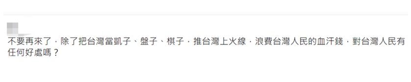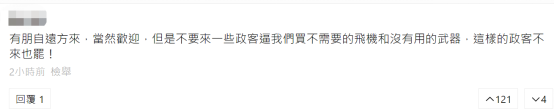 也有網友説,“不要再來了,除了把台灣當凱子(傻子)、盤子(傻子)、棋子,推台灣上火線,浪費台灣人民的血汗錢,對台灣人民有任何好處嗎?”↓