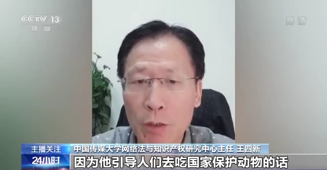 *中國傳媒大學網絡法與知識產權研究中心主任 王四新:*因為他引導人們去吃國家保護動物的話,勢必會導致國家保護動物遭受更多人的捕獵,遭受更多瀕臨滅絕的危險,也會誘導人們形成不正確的吃東西的方式。