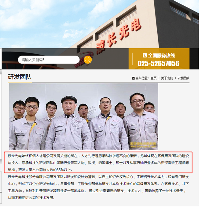 根據公司官網介紹:波長光電始終相信人才是公司發展關鍵的所在,人才先行是恩承科技永遠不變的承諾,尤其體現在環保研發團隊的建設與投入。恩承科技的研發團隊由國際行業領軍人物、教授、歸國博士、碩士及從事石油行業多年的資深高級工程師等組成,研發人員佔公司總人數的35%以上。
