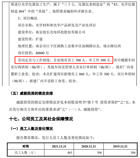 此外,這份2022年2月發佈的《建設項目環境影響報告表——光學材料和光學產品研發及產業化項目》還介紹,波長光電現有員工300人。但招股書卻披露,截至2021年末,公司員工465人,差異高達165人。波長光電員工究竟有多少?《招股説明書》與《建設項目環境影響報告表》的公開信息存在明顯矛盾。