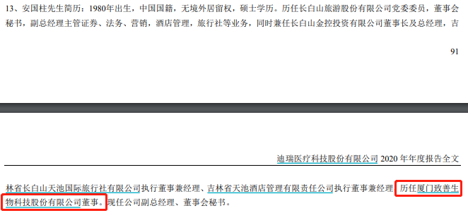 不僅如此,迪瑞醫療在2020年年報第91頁披露,該公司的副總經理、董事會秘書安國柱“歷任廈門致善生物科技股份有限公司董事”,這也就意味着截止到2020年末時安國柱曾擔任過致善生物的董事。但是根據致善生物招股書披露,2021年2 月9日公司召開2021年第一次臨時股東大會,宋潔因工作調動 辭去公司董事,公司補充選舉安國柱為公司董事。也即安國柱在2020年末之前並未擔任過致善生物的董事,致善生物與迪瑞醫療的信息披露存在矛盾。
