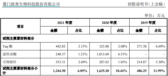 此外,致善生物的主要產品包括分析診斷試劑,該產品對應的主要原材料為生物酶,包括Taq 酶和逆轉錄酶。招股書披露公司的分子診斷試劑產量在2021年出現了大幅增長,增幅高達50%以上,而與此同時,Taq 酶和逆轉錄酶在採購單價小幅增長的背景下,Taq 酶採購金額僅同比增長了40%左右,逆轉錄酶採購金額則大幅減少了70%。上述數據指向公司的分析診斷試劑產品產量大幅增長的同時,核心原材料生物酶的採購數量卻大幅下滑,這違背了正常的經營邏輯。