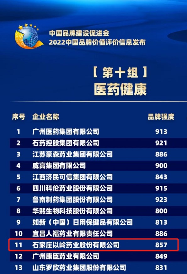 2022中國品牌價值評價信息發佈,以嶺藥業位列醫藥健康類第11位