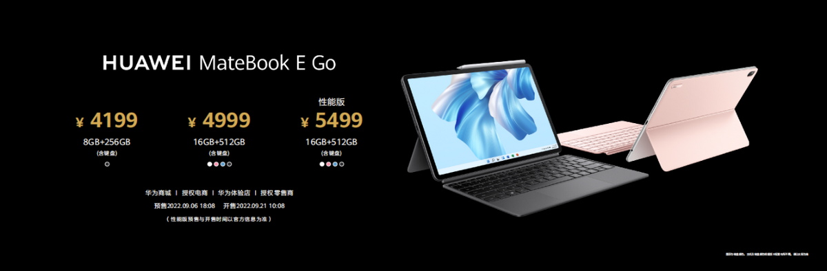 華為MateBook E Go標準版8GB+256GB售價4199元,16GB+512GB售價4999元,性能版16GB+512GB售價5499元(均含鍵盤)。
