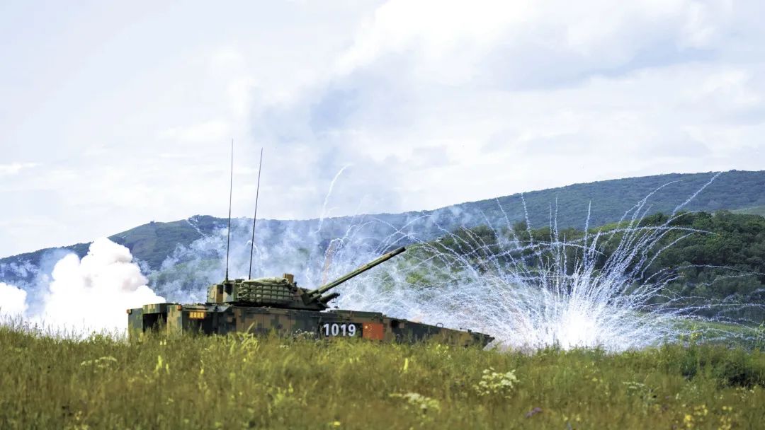 坦克、步戰車縱橫馳騁,導彈、火炮發出陣陣怒吼,讓大地為之震顫。一波又一波來自中方參演部隊發出的炮彈,直撲“敵”各個目標,大地騰起陣陣煙霧。