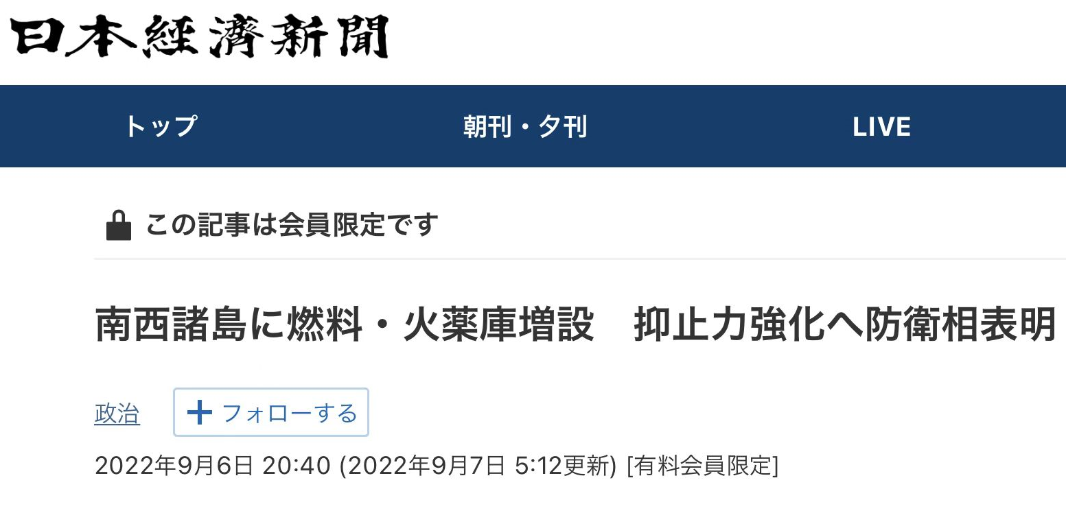 《日本經濟新聞》報道稱,日本目前約7成的彈藥都儲藏在北海道,日本政府打算採取措施以改變這種狀況並強化持續作戰能力。浜田靖一稱,作為初步措施,日方將在鹿兒島縣奄美大島的自衞隊駐地設置彈藥庫。報道聲稱,日方考慮利用該新設彈藥庫儲存防區外導彈等裝備。