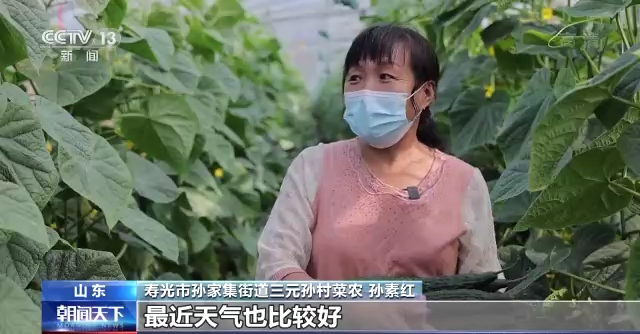 *山東壽光市孫家集街道三元孫村菜農 孫素紅:*一天摘八九百斤左右,最近天氣也比較好,你看棚裏的黃瓜長勢也很好,所以説接下來產量會越來越高。