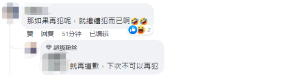有人質疑,“那如果再犯呢,就繼續犯而已啊!”有網友回覆,“就再道歉,下次不可以再犯。”還有人喊,“説説再犯了會怎麼樣。”↓