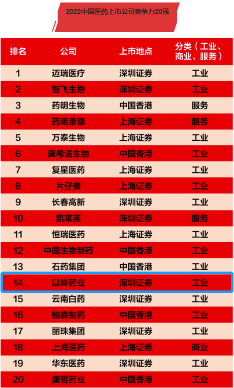 以嶺藥業蟬聯2022中國醫藥上市公司競爭力20強榜單