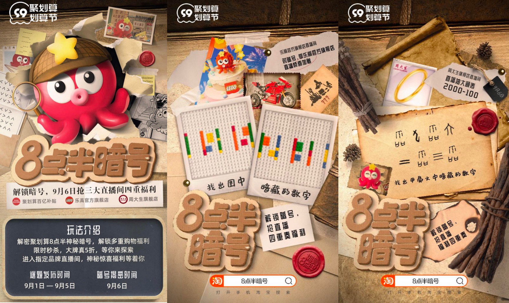 在此次划算節的預熱期,聚划算打造了一場全民對暗號的營銷互動事件,以內容化升級為直播預熱蓄水。“8點半暗號”的互動遊戲因為囊括詩詞歌賦、數理化生甚至甲骨文燃起了一股全民破解暗號的風潮,大家的熱情不亞於玩劇本殺找兇手,而這種吊足胃口又讓用户充滿解題勝負欲的玩法也讓“8點半暗號”成為年輕人近期社交平台頻頻熱議的社交話題。