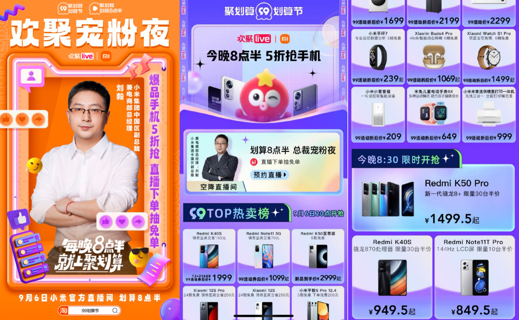 為助力99期間品牌大爆發,歡聚日直播態IP“歡聚live”在此次99大促首發上線,攜手小米、李寧、海爾、林氏木業、薇諾娜、巴黎歐萊雅、周大生、斯凱奇、寶潔、資生堂等十大品牌開啓專場直播。小米“歡聚live”專場,小米中國區副總裁兼電商總經理空降直播間發放寵粉福利,更有Redmi K50 Pro等數百台手機直播間5折搶等驚喜。當日小米開賣4小時店播成交金額即超1500萬,超日常爆發3倍,店播行業排名Top1。