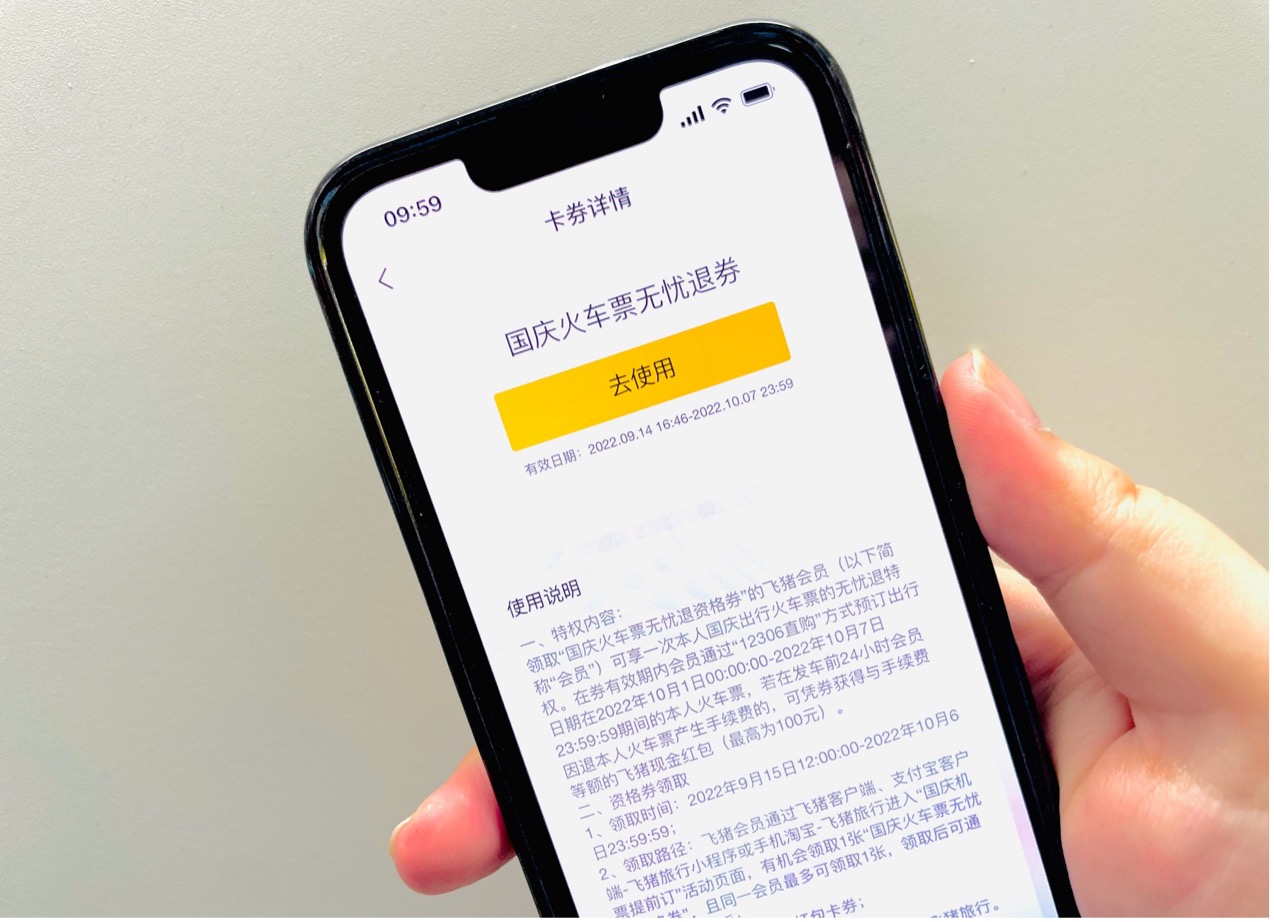 近日,飛豬推出十一假期火車票無憂退服務。消費者在活動頁面領取“國 慶火車票無憂退資格券”後,在發車時間24小時前退票,可獲得等同於退票費的現金紅包,最高補貼達100元。目前,在飛豬App的活動規則頁面看到,該權益的領取時間為9月15日-10月7日。出行日期在10月1日-10月7日期間、乘車人為會員本人的火車票,如發生退票均可獲得相應補貼。