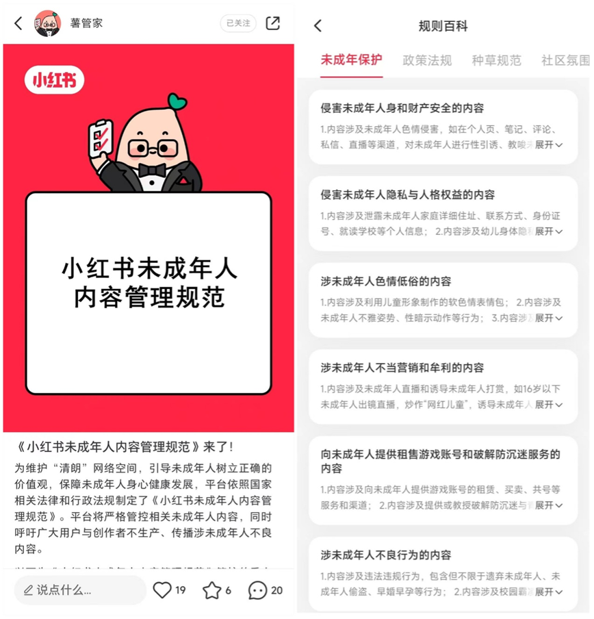 同一天,小紅書在創作中心“規則百科”上線《小紅書未成年人內容管理規範》,強調對七大類涉及未成年人的內容加強管理,保障未成年人安全使用社區產品。