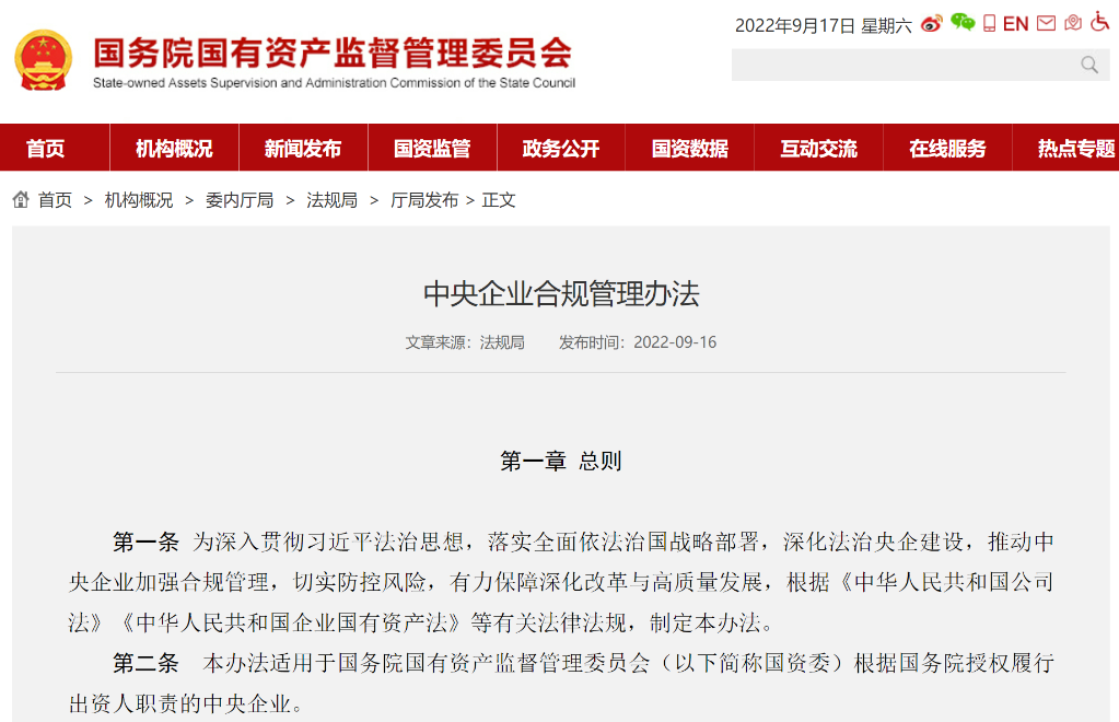 國務院國資委日前印發《中央企業合規管理辦法》,推動中央企業加強合規管理,切實防控風險,有力保障深化改革與高質量發展。辦法自2022年10月1日起施行。