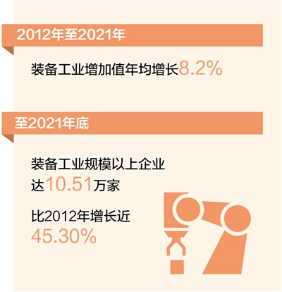 產業規模持續擴張。至2021年底,裝備工業規模以上企業達10.51萬家,比2012年增長近45.30%;資產總額、營業收入、利潤總額分別達到28.83萬億元、26.47萬億元和1.57萬億元,分別比2012年增長92.97%、47.76%和28.84%。