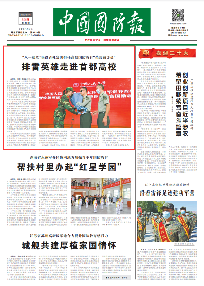 4月25日,習主席在中國人民大學考察調研時強調,“廣大青年要做社會主義核心價值觀的堅定信仰者、積極傳播者、模範踐行者,向英雄學習、向前輩學習、向榜樣學習,爭做堪當民族復興重任的時代新人,在實現中華民族偉大復興的時代洪流中踔厲奮發、勇毅前進。”前不久,中共中央、國務院、中央軍委印發《關於加強和改進新時代全民國防教育工作的意見》明確,探索建立軍人、退役軍人擔任青少年國防教育輔導員制度。中國人民大學邀請杜富國擔任國防教育“榮譽輔導員”,助力學校國防教育工作。