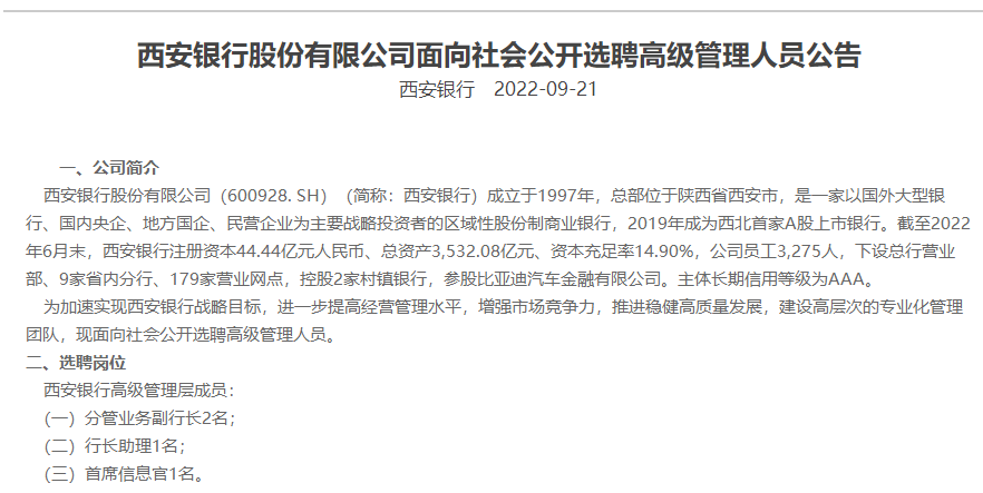 西安銀行公告稱,選聘人員按照職業經理人管理,任期三年,任期期滿考核合格可續聘。簡歷投遞截止時間為10月18日。