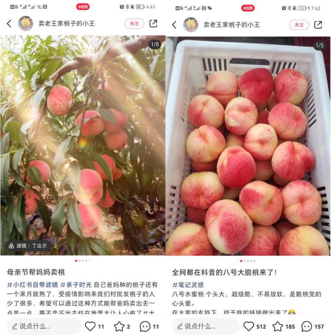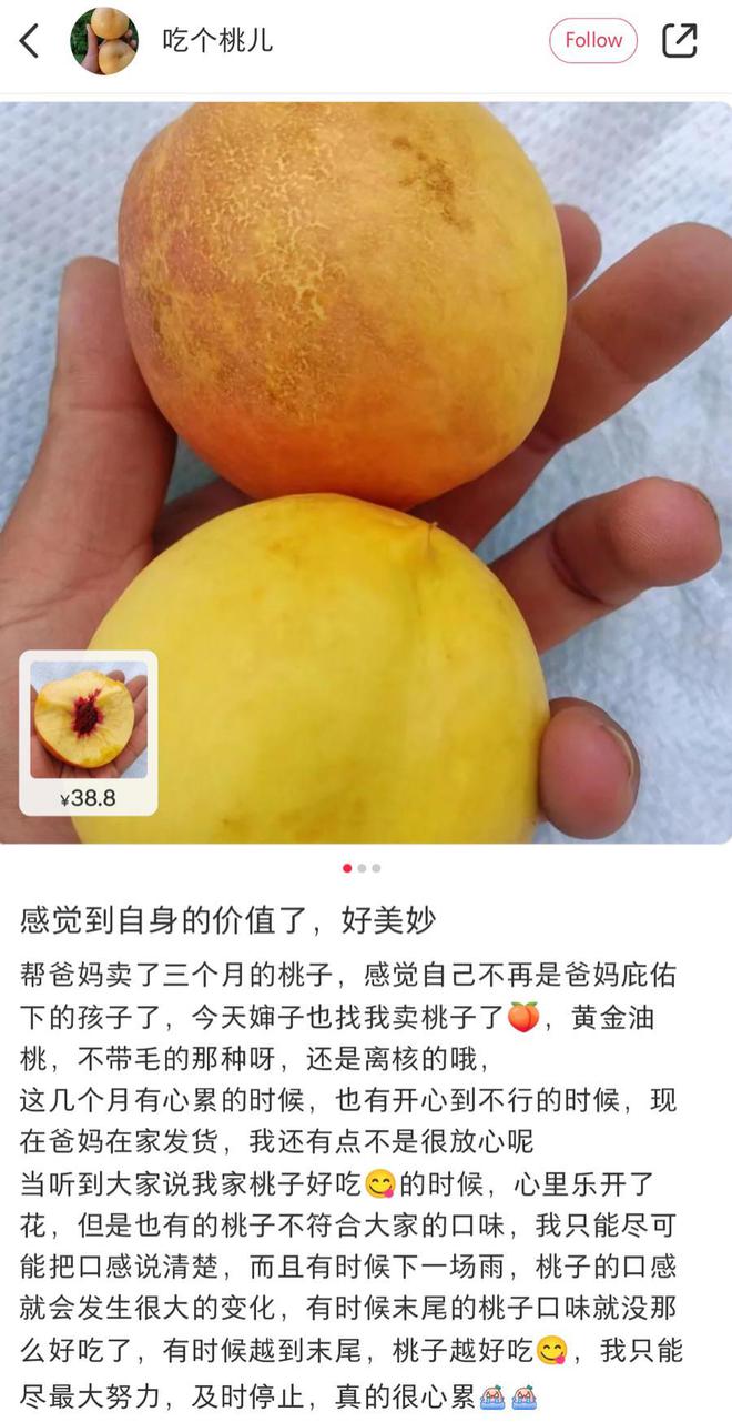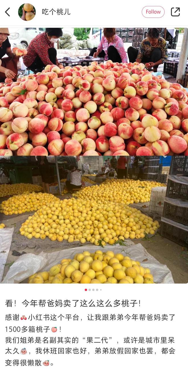 去年,馮宇家的桃子都賣給了批發點,只拿到了相當於總價一半的預付款,剩餘的尾款杳無音訊。看到父母辛苦一年的成果打了水漂,馮宇和正在讀大學的弟弟非常心疼。今年桃子成熟後,姐弟二人決定在小紅書開店鋪幫父母賣桃。
