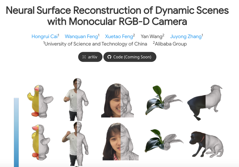 隨着深度學習的發展,基於隱式表示的3D建模和圖形渲染已經成為一項趨勢。據悉,銀泰百貨的這項研究提出了神經網絡動態重建的新方法,使用一段RGB-D視頻作為輸入,得到動態物體的幾何、運動及外觀信息。這項工作創新性地設計了一個可逆的雙射映射來實現物體動態形狀與基準幾何形狀之間的變換,使物體建模更精確,有效改善了此前3D動態建模上存在的孔洞、噪聲等問題。
