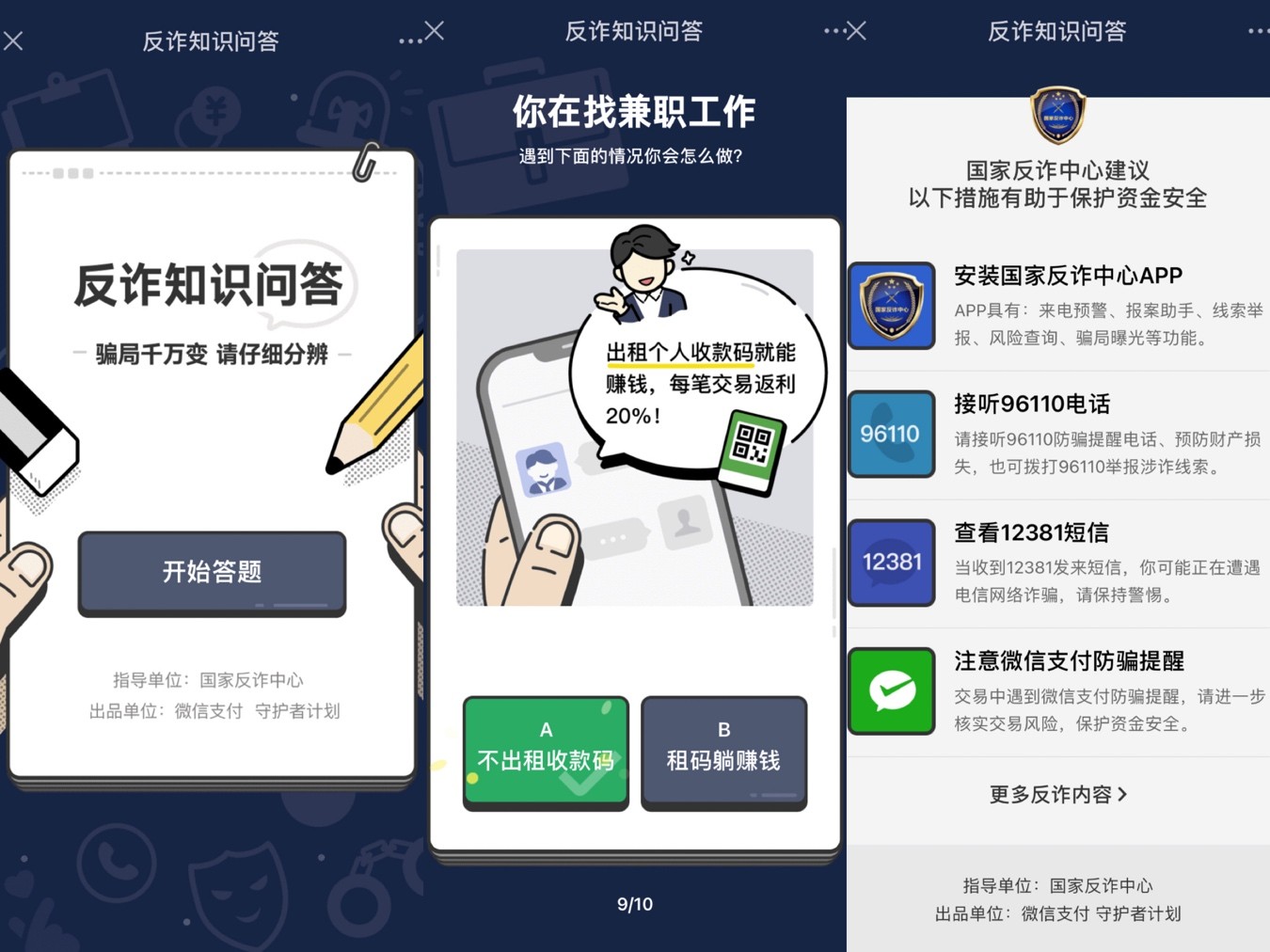 即日起,打開手機QQ AR 功能,掃描自己的手掌,即可隨機獲取一款國家反詐中心推薦的反詐利器。由國家反詐中心指導,微信支付、守護者計劃聯名發佈的“反詐答題H5”互動小程序,將生活中常見的電信網絡詐騙設計為生動的場景考題,內容涵蓋社交詐騙、投資詐騙、刷單詐騙、冒充公檢法、租用收款碼、快遞退賠騙局等,以真實詐騙案例警醒答題者,在趣味性互動中增強公眾自身的反詐安全防範意識。