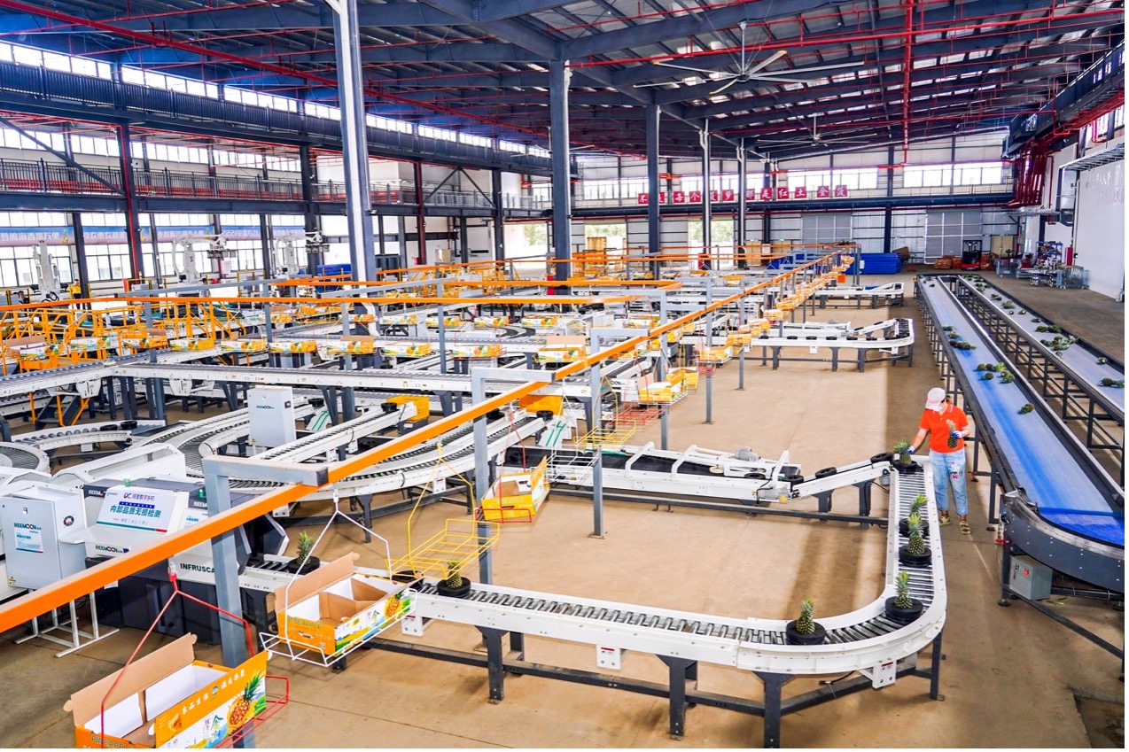 在徐聞產地倉,一顆顆菠蘿正在通過數字化分選線,按大小、外表、糖度、上水、黑心等標準進行分選分級與自動化打包,並通過相應的冷鏈儲運發向全國。