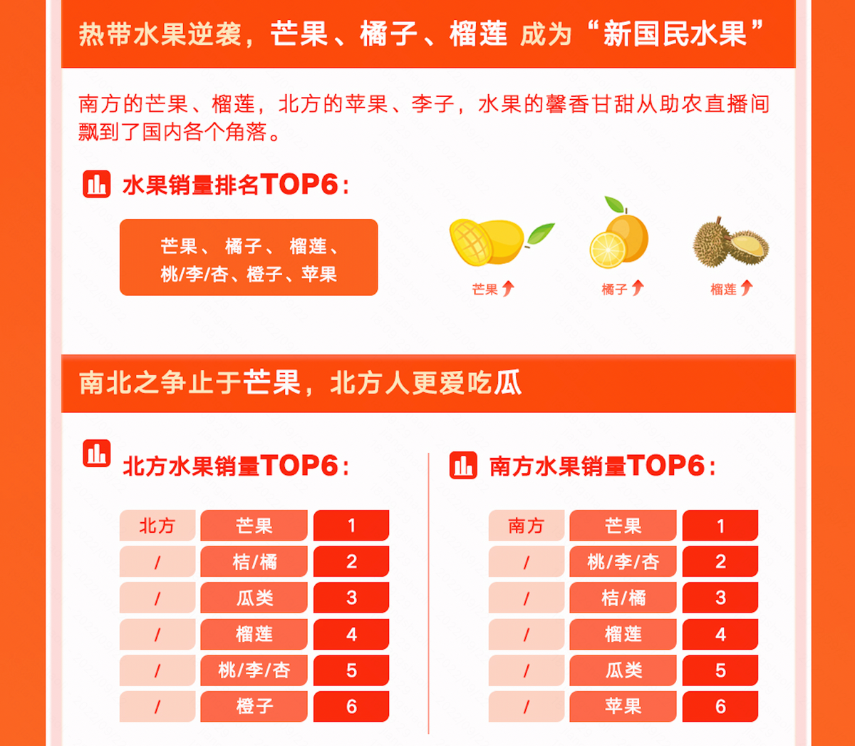 “直播+短視頻”一面打通了農產品的銷路,一面也滿足了人們對各地新鮮瓜果蔬菜的口腹之慾。南方的芒果、榴蓮,北方的蘋果、李子,水果的馨香甘甜從助農直播間飄到了國內各個角落。《報告》顯示,2022年1月至8月期間,快手平台上銷量最高的水果TOP 6分別是為芒果、橘子、榴蓮、桃/李/杏、橙子、蘋果,熱帶水果獨霸前三甲。且無論南北方,芒果都格外受歡迎,成為當之無愧的“新國民水果”。
