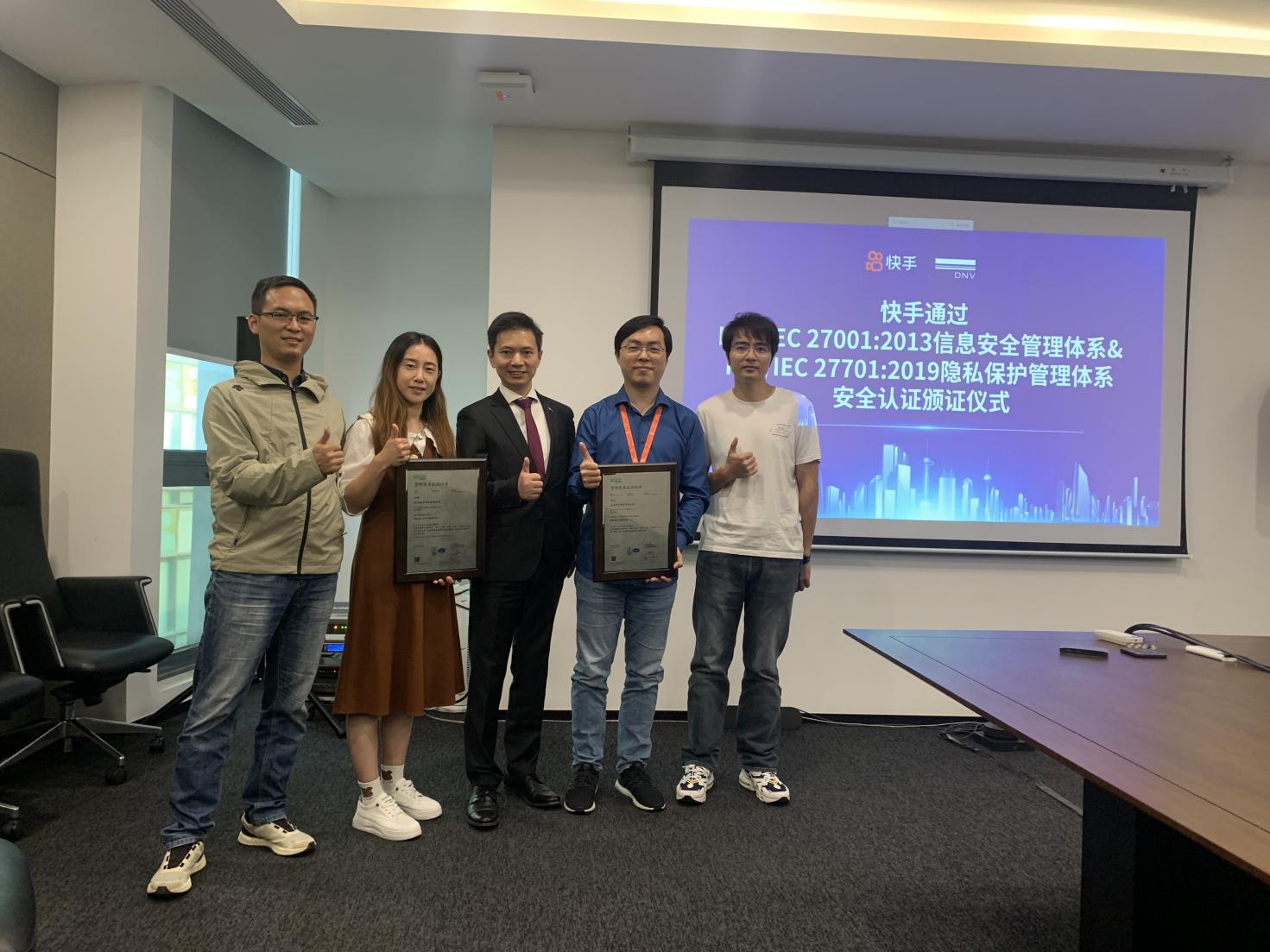 DNV管理服務集團大中國區業務發展總經理蘭錦、快手主站技術負責人王仲遠、快手信息安全中心負責人胡大磊等一行人蔘與了此次頒證儀式