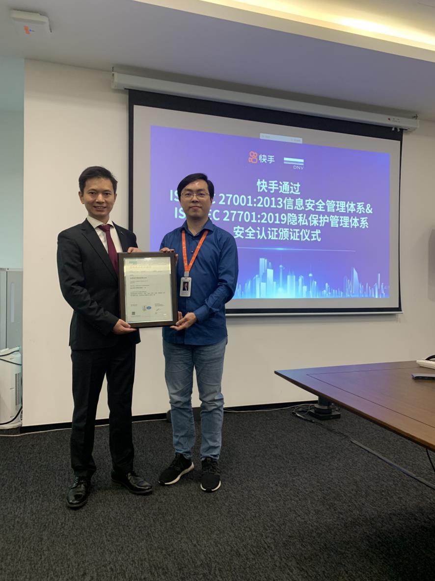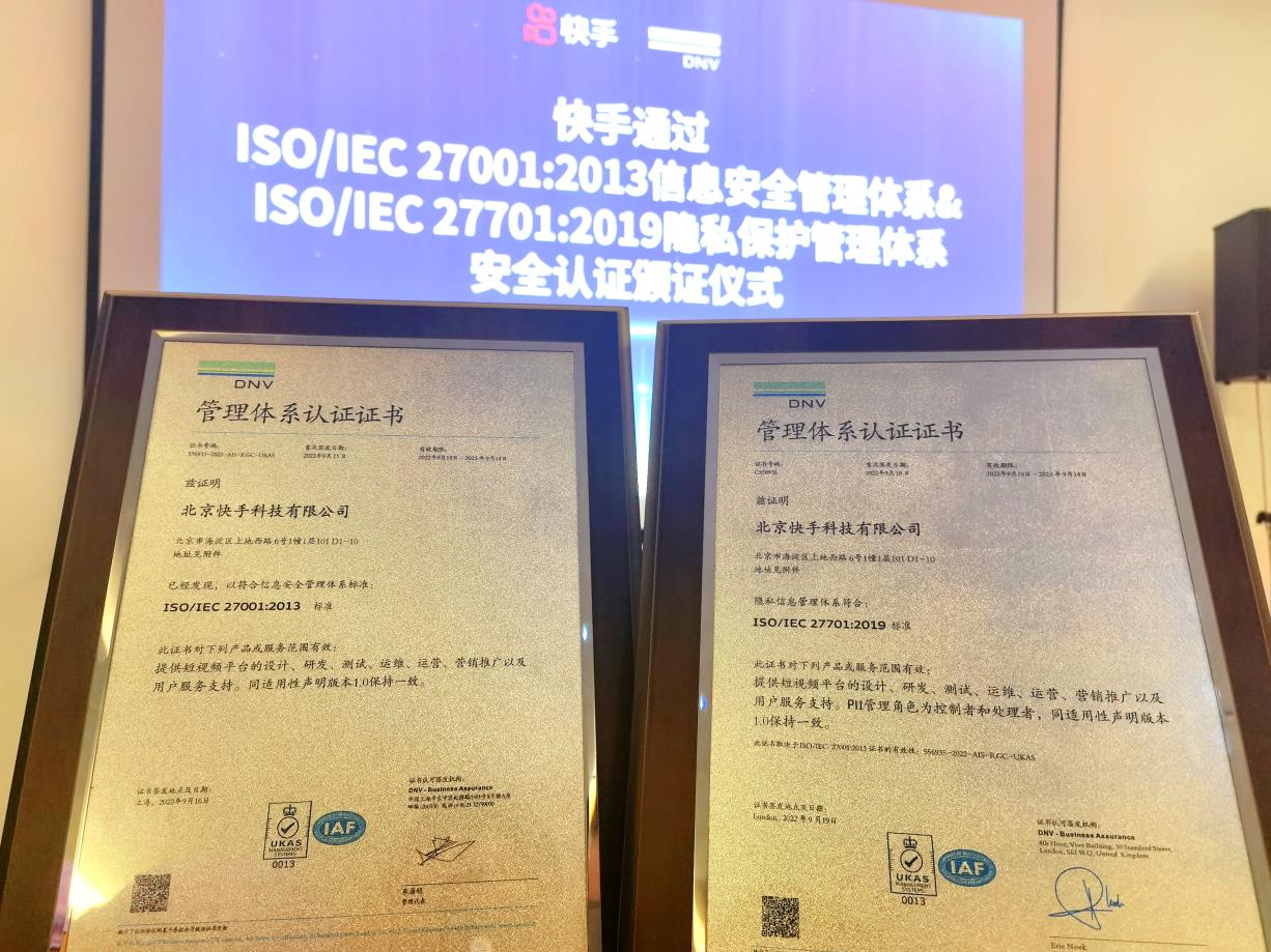 9月27日,專業風險管理服務機構DNV向快手頒發了ISO/IEC 27001和ISO/IEC 27701國際認證證書。這意味着快手平台的信息安全和隱私保護機制符合國際標準化組織(簡稱ISO)的權威要求,相關保護能力已經達到國際領先水平。