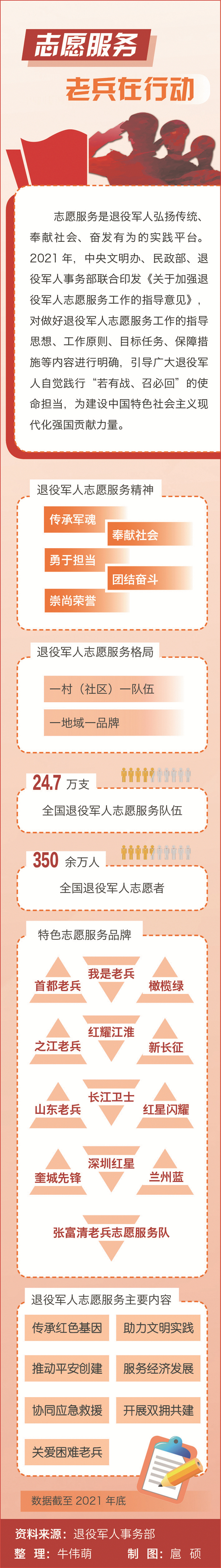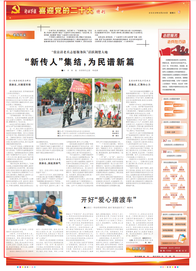 一個英雄名,凝聚老兵志。在部隊保家衞國,到地方為民造福,2020年以來,在張富清老英雄的精神感召下,湖北各地退役軍人志願服務隊集結在“張富清老兵志願服務隊”的旗幟下,秉持為民初心、不改軍人本色,一隊隊“紅馬甲”穿梭大街小巷、行走田間地頭,在志願服務中作表率、當先鋒、樹形象,成為荊楚大地上行走的紅色力量。