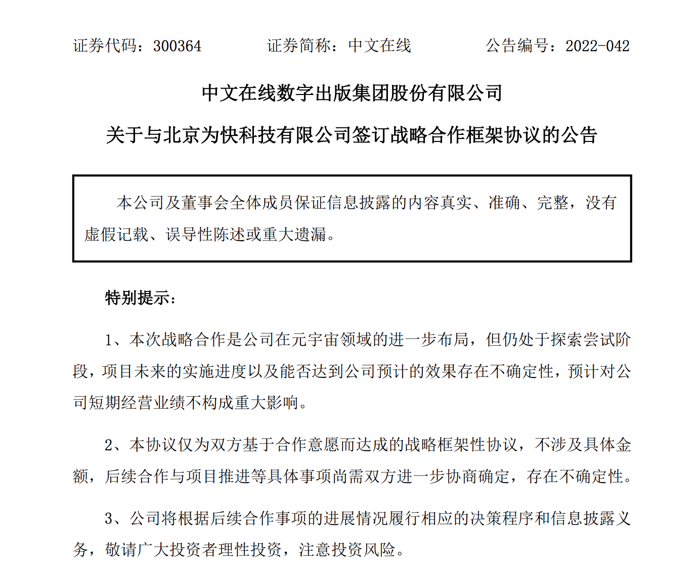 具體合作內容方面,公告顯示,為快科技(VeeR)計劃每年製作出品多部頭部IP的VR精品內容,並做全球發行。針對每部出品內容,VeeR為中文在線預留一定比例投資份額,中文在線可作為聯合出品方與VeeR共同出品VR內容。基於雙方的合作,VeeR在上述每年多部VR頭部影視作品的產能中,預留不低於2部作為雙方聯合開發的項目;由中文在線提供優質IP,雙方共同策劃,共同投資,由VeeR製作並全球發行VR內容。聯合開發的VR作品來源包括但不限於中文在線旗下“全球元宇宙徵文大賽”獲獎作品、“奇想宇宙”系列科幻作品、 “謎想計劃”系列推理懸疑作品等。VeeR負責VR內容的全球發行,為合作VR內容爭取主流/一線VR硬件或主流/一線VR應用商店中重點推廣資源。發行渠道包括但不限於Oculus、HTC、PICO、PSVR、WMR、STEAM、愛奇藝VR、HUAWEI VR等。