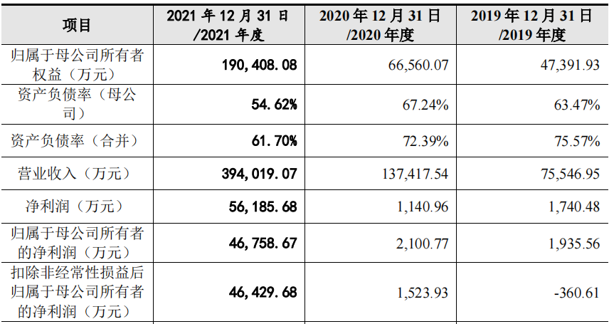2019-2021年,德福科技分別實現營收7.55億元、13.74億元和39.40億元,年複合增長率達128.44%,其中2021年營收相比2020年翻了近三倍。