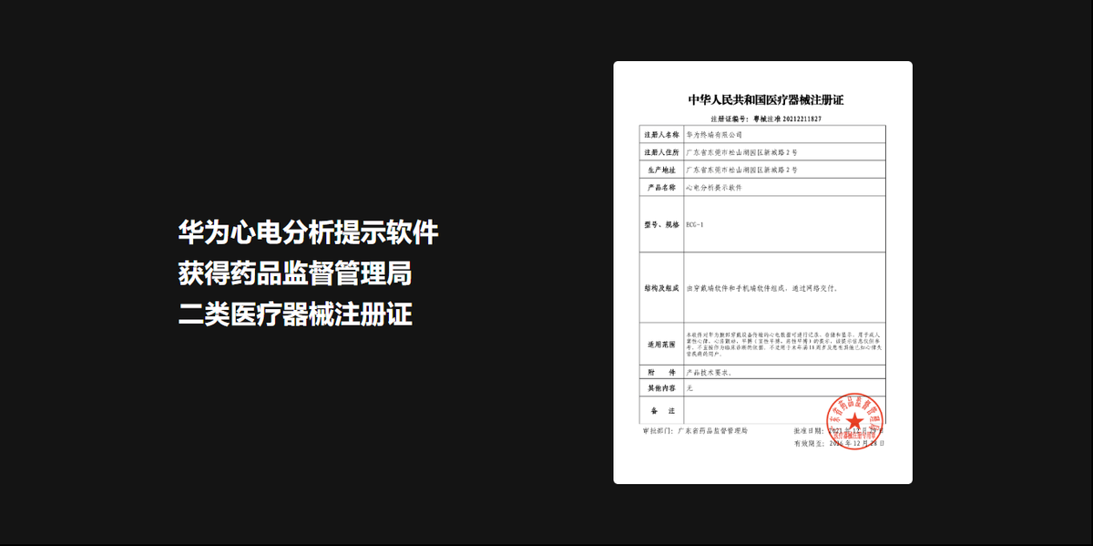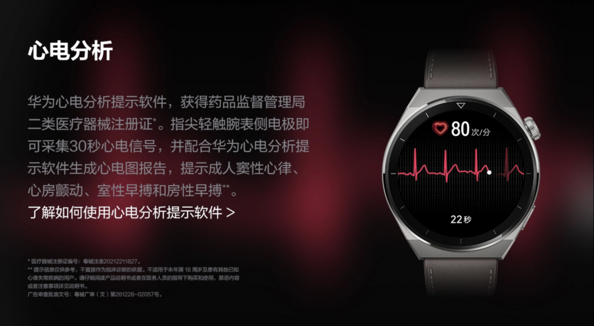 目前,華為WATCH GT 3 Pro全系搭載ECG功能,華為WATCH GT 2 Pro ECG款、華為WATCH D腕部心電血壓記錄儀、華為心電分析提示軟件都獲得國家藥品監督管理局二類醫療器械註冊證,可以對房顫、早搏、血壓等心血管健康問題進行前期篩查。