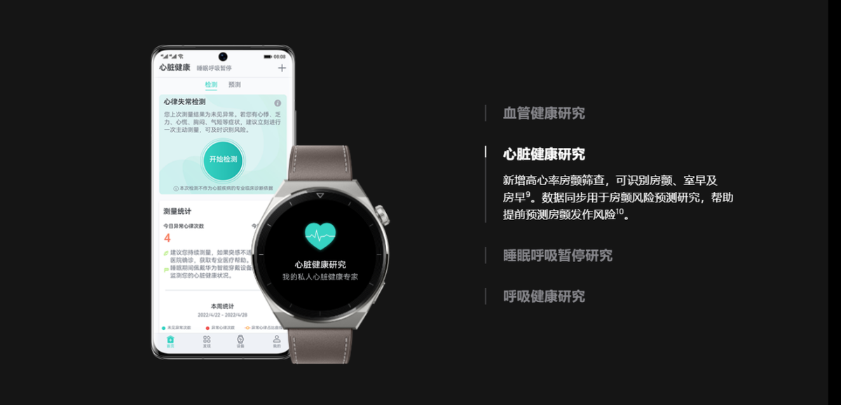 301醫院基於華為穿戴設備和HUAWEI Research平台,啓動心臟健康研究,上線4年以來,超過450萬用户加入研究。其中,超99萬用户檢測出心律失常風險,累計篩查出疑似房顫的的用户超1.6萬人,房顫篩查準確率高達92.8%;另外,中國醫療保健國際交流促進會也基於HUAWEI Research平台發起血管健康研究,截至2022年6月底,已有超60萬用户加入此項研究,累計篩查疑似血管健康高風險用户3700人。