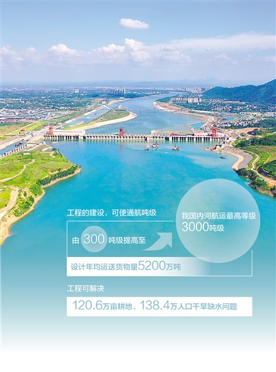 工程的防洪、航運、發電、水資源配置、灌溉等綜合效益顯著。作為流域防洪控制性工程,工程可調節水庫庫容15億立方米。作為距離珠江三角洲最近的流域水資源配置骨幹工程,可使粵港澳大灣區應急調水響應時間由原來的7天至10天縮短至3天,有力保障粵港澳大灣區用水安全。工程的建設,可使通航噸級由300噸級提高至我國內河航運最高等級3000噸級,設計年均運送貨物量5200萬噸。此外,工程還可解決120.6萬畝耕地、138.4萬人口乾旱缺水問題。