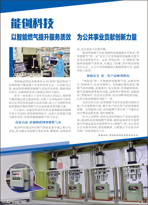 綿陽能創科技有限責任公司(簡稱“能創科技”)是綿陽燃氣集團旗下首家科技型企業。以創新為引領,能創科技精耕智能燃氣設備研發製造、物聯網技術研究、互聯網服務及大數據應用四大板塊。