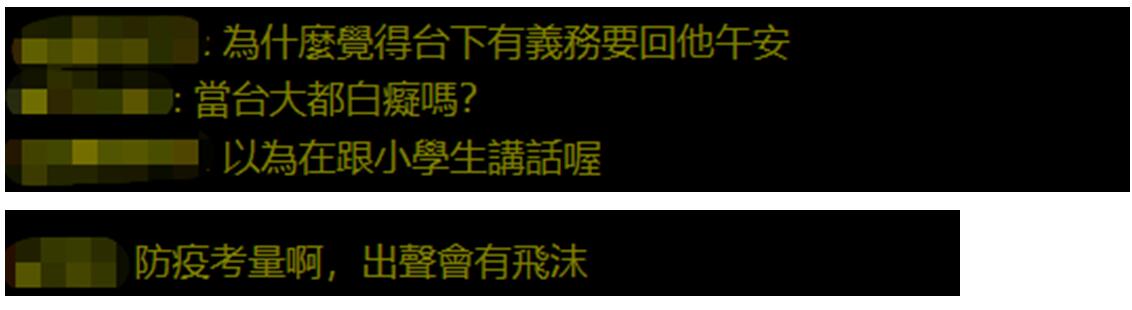 還有人質疑,“為什麼覺得台下有義務要回他午安。”“當台大都白痴嗎?”“以為在跟小學生講話喔。”“防疫考量啊,出聲會有飛沫。”↓