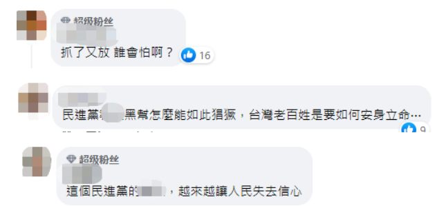 還有人稱,“抓了又放,誰會怕啊?”“民進黨‘執政’黑幫怎麼能如此猖獗,台灣老百姓是要如何安身立命?”“民進黨‘執政’,越來越讓人民失去信心。” ↓