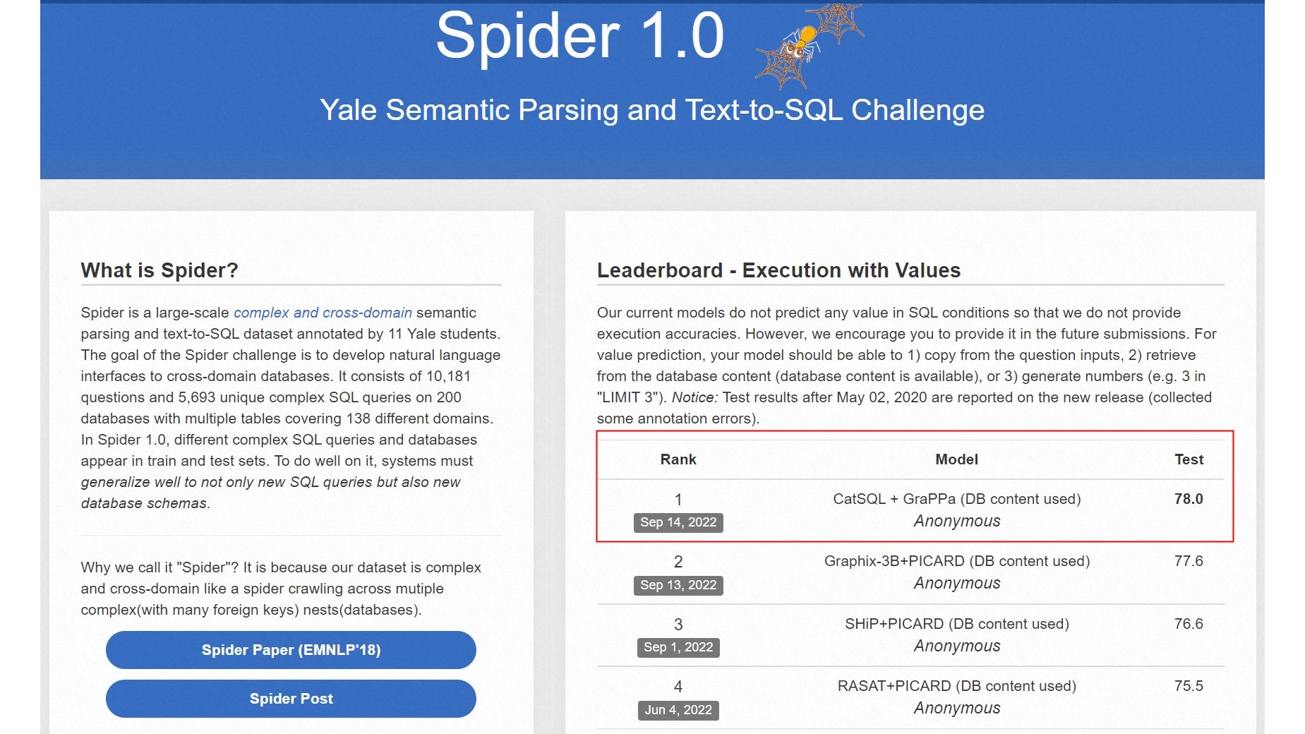 日前,阿里雲數據庫參加耶魯大學Spider數據集評測,以78分的成績排名榜單第一。這一成績證明了阿里雲數據庫在NL2SQL技術上的國際領先性。據瞭解,Spider是業界公認的大規模跨領域複雜NL2SQL轉換效果的評測榜單。