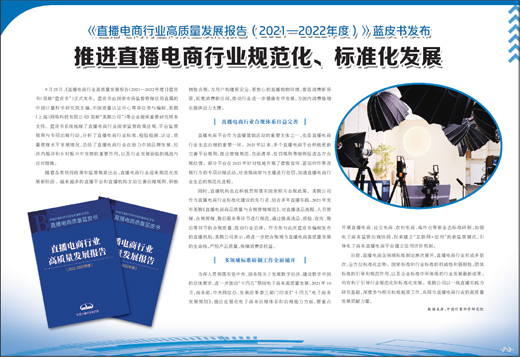 9月25日,《直播電商行業高質量發展報告(2021—2022年度)》藍皮書(簡稱“藍皮書”)正式發佈。藍皮書由國家市場監督管理總局直屬的中國計量科學研究院主編、中國質量認證中心等單位參與編制、美腕(上海)網絡科技有限公司(簡稱“美腕公司”)等企業提供重要研究樣本支持。藍皮書系統梳理了直播電商行業國家監管政策法規、平台監管規則與專項治理行動,分析了直播電商行業標準、檢驗檢測、認證、質量管理水平發展情況,總結了直播電商行業在助力中國品牌發展、經濟內循環和鄉村振興中發揮的重要作用,以及行業發展面臨的挑戰與應對措施。